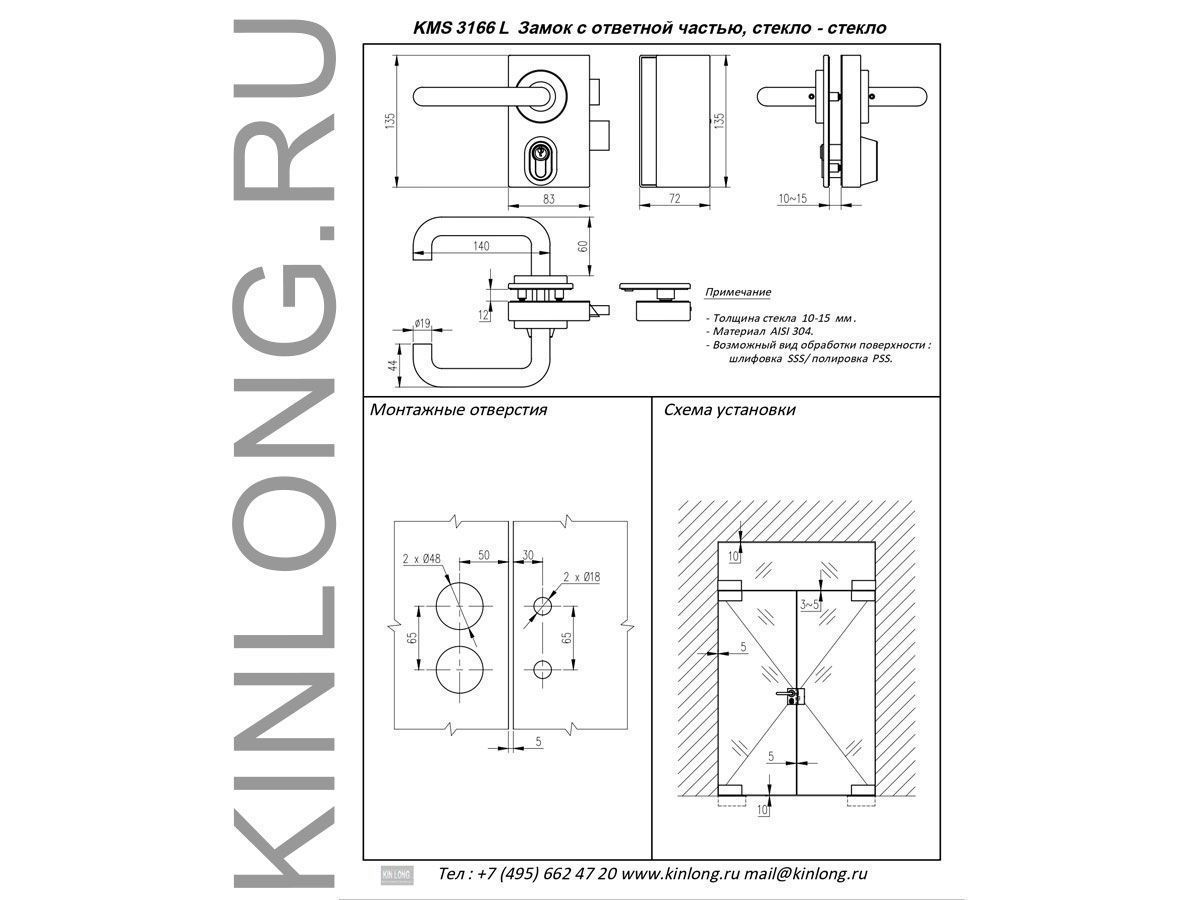 | Скачать Чертеж PDF KMS3166L Нажимной гарнитур замок AISI 304 SSS KINLONG | ||||||