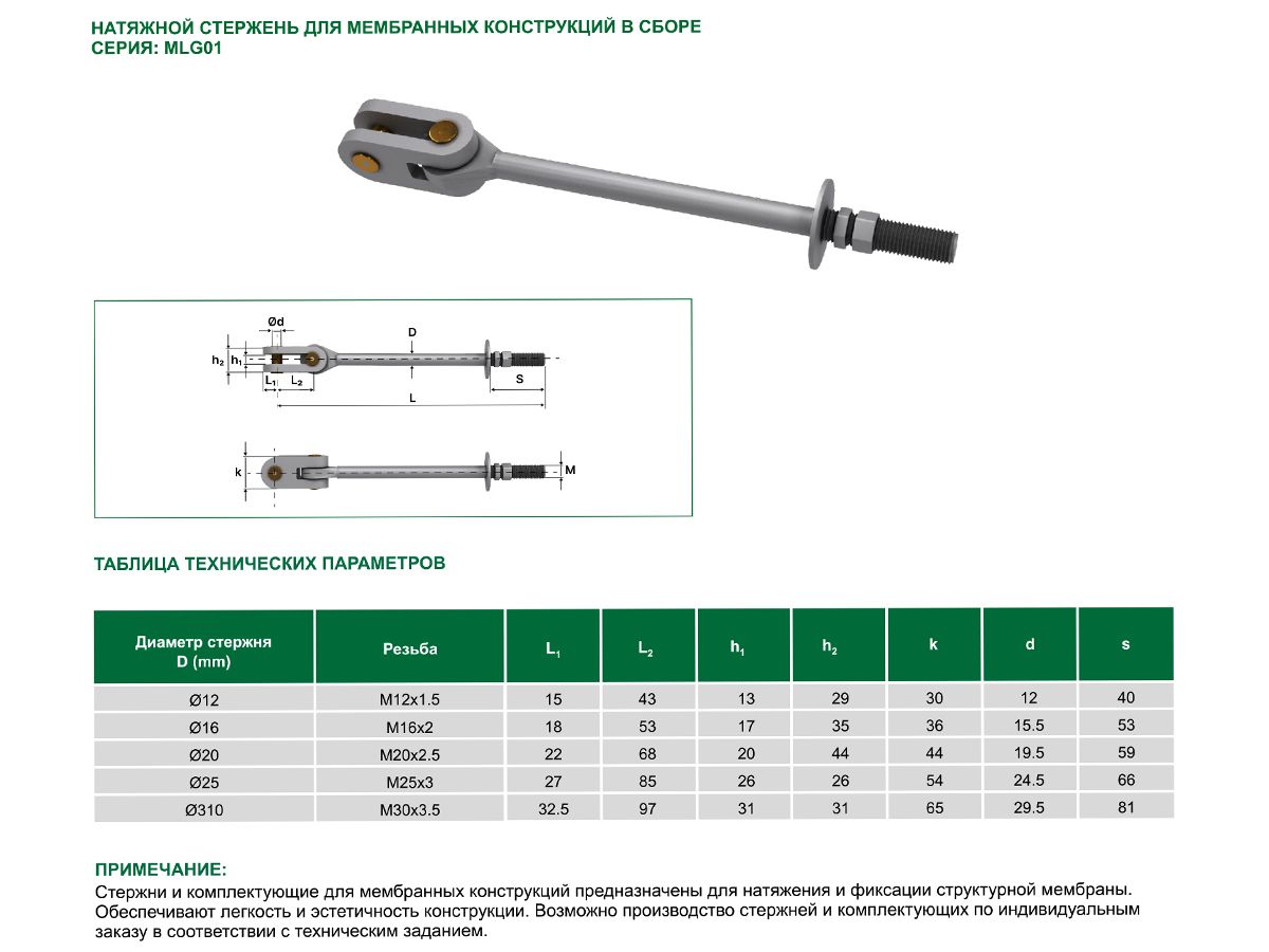 Стальной натяжной стержень MLG01 представляет собой конструкцию стержня в сборе с наконечником и системой крепления.