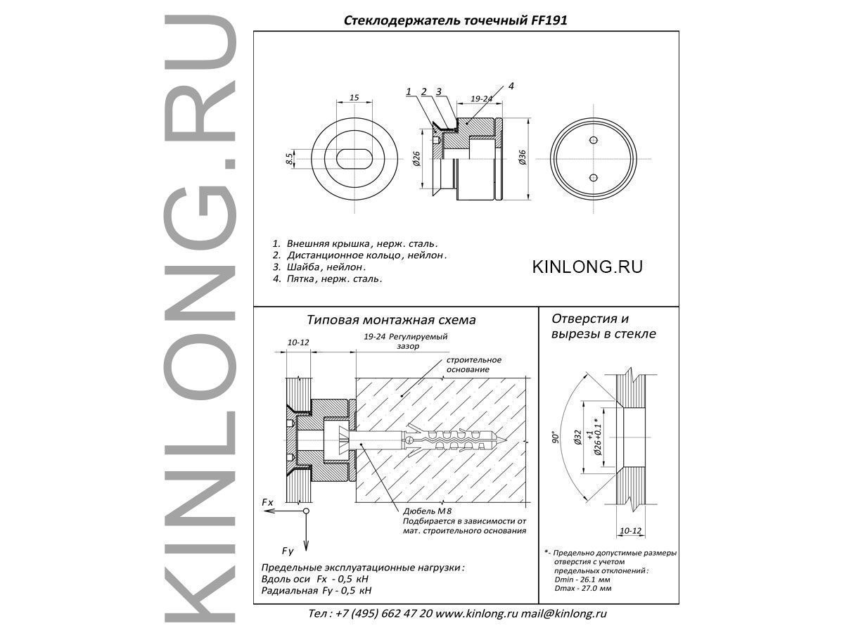 Стеклодержатель точечный FF191, один из вариантов крепления цельностеклянных ограждений, перегородок и других конструкций из стекла толщиной от 8 мм до 12 мм. Корпус стеклодержателя изготовлен из нержавеющей стали марки AISI 304. Отверстие под точечное крепление с зенковкой. Регулируемое крепление с отступом от стены от 19 мм до 24 мм. Тип крепления подбирается в зависимости от материала несущего основания. Предельные эксплуатационные нагрузки: вдоль оси Fx – 0,5 kH, радиальная Fy – 0,5 kH. Вес изделия - 0.04 кг.