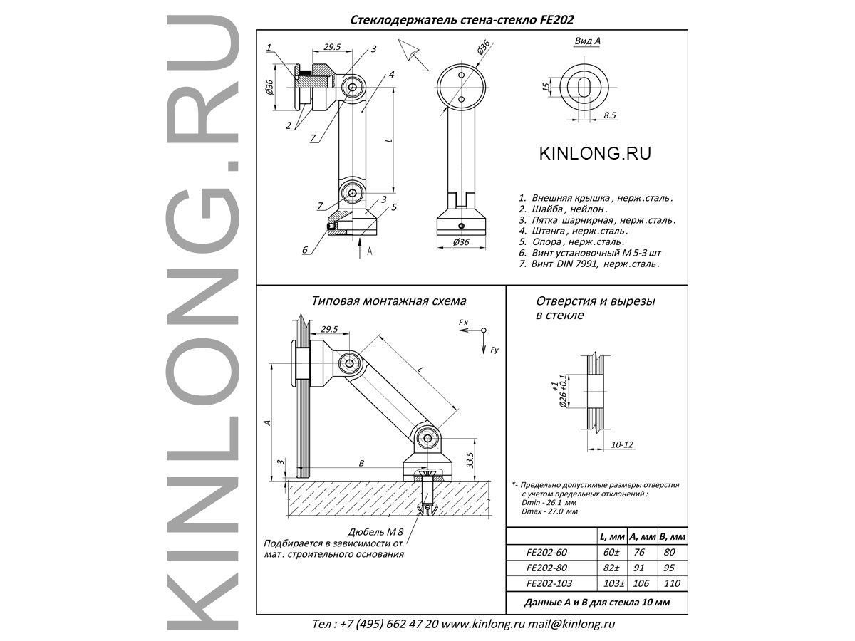 | Скачать Чертеж PDF FE202-82 Cтеклодержатель стена-стекло 90-180 град, штанга 82 мм, крышка AISI 304, SSS KINLONG | ||||||