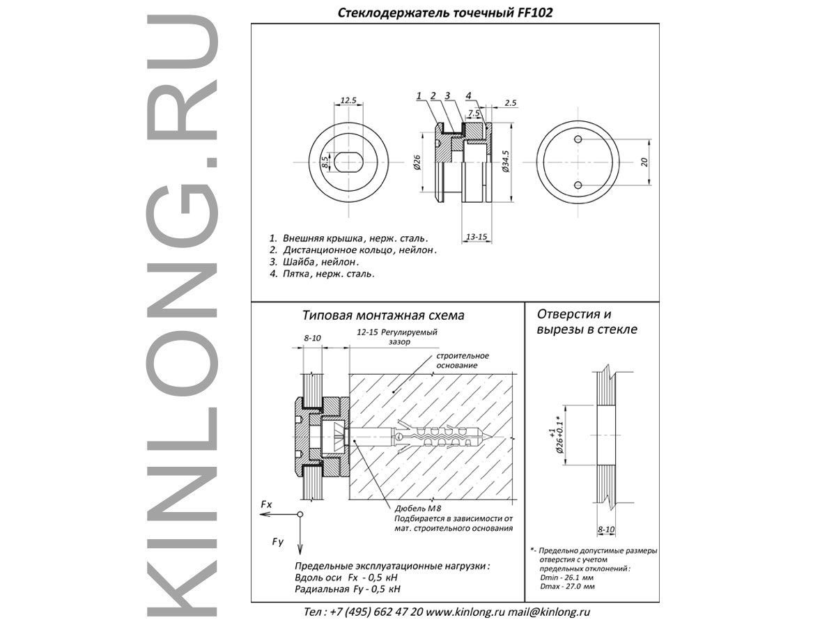 Стеклодержатель точечный FF102, один из вариантов крепления цельностеклянных ограждений, перегородок и других конструкций и стекла толщиной от 8 до 10 мм. Корпус стеклодержателя изготовлен из высокопрочной нержавеющей стали марки AISI 304. Отверстие под точечное крепление диаметром 26 мм. Стеклодержатель позволяет закрепить стекло с регулируемым отступом от поверхности равным 12-15 мм. Тип крепления подбирается в зависимости от материала несущего основания. Предельные эксплуатационные нагрузки: вдоль оси Fx – 0,5 kH, радиальная Fy – 0,5 kH. Вес изделия - 0.09 кг.
