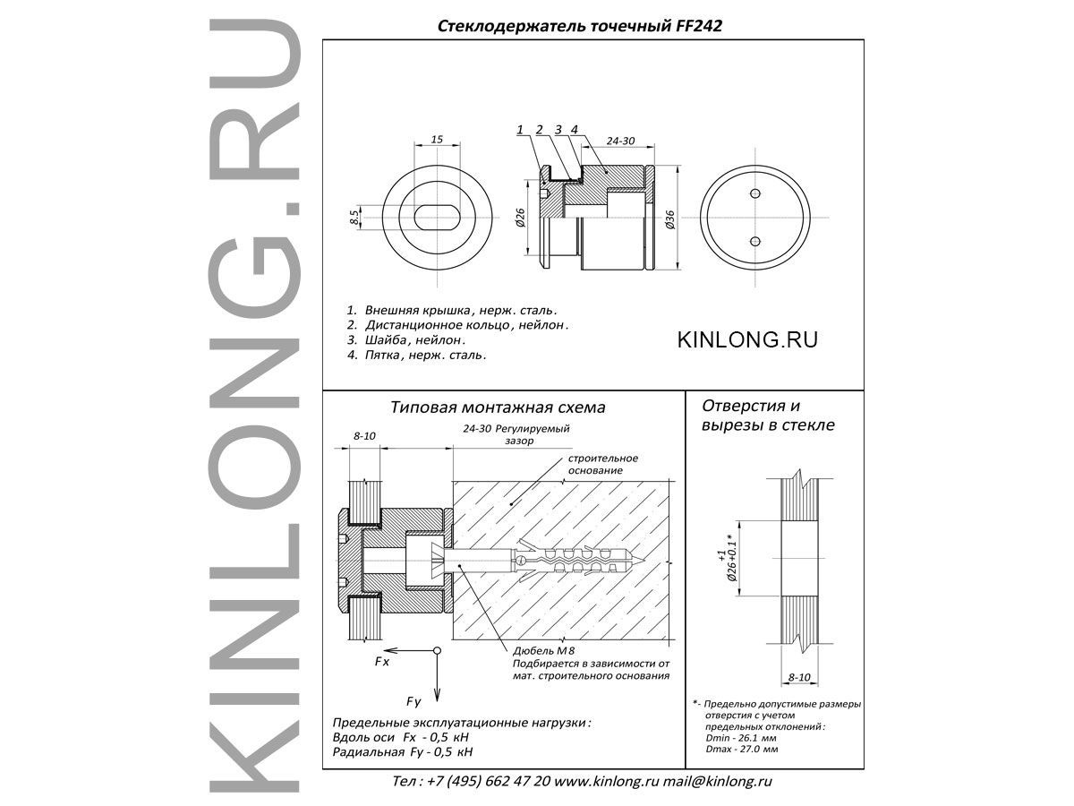 Стеклодержатель точечный FF242, один из вариантов крепления цельностеклянных ограждений, перегородок и других конструкций из стекла толщиной от 8 мм до 10 мм. Корпус стеклодержателя изготовлен из нержавеющей стали марки AISI304. Отверстие под точечное крепление диаметром 26 мм. Стеклодержатель позволяет закрепить стекло с регулируемым отступом от поверхности равным 24-30 мм. Тип крепления подбирается в зависимости от материала несущего основания. Предельные эксплуатационные нагрузки: вдоль оси Fx – 0,5 kH, радиальная Fy – 0,5 kH. Вес изделия - 0.09 кг.