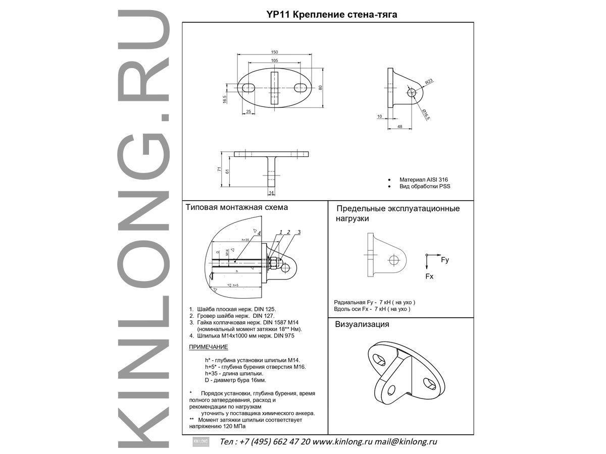 | Скачать Чертеж PDF YP11 Крепление стена-тяга, AISI 316, PSS KINLONG | ||||||