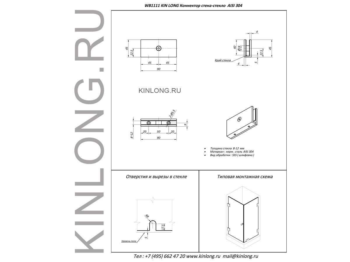 | Скачать Чертеж PDF WWB11110 Коннектор стена-стекло, AISI 304, SSS KINLONG | ||||||
