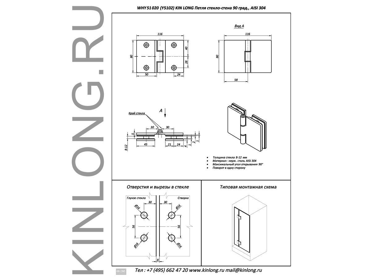 | Скачать Чертеж PDF WHY51020 (Y5102) Петля стекло-стекло без фиксации, SSS, AISI 304 KINLONG | ||||||
