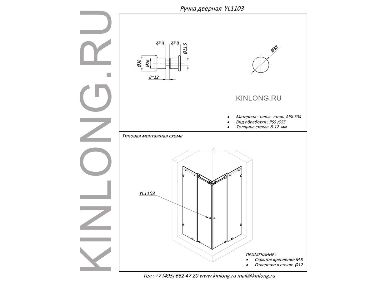 | Скачать Чертеж PDF WLS91030 (YL1103) Ручка для стеклянной двери, AISI 304, PSS KINLONG | ||||||